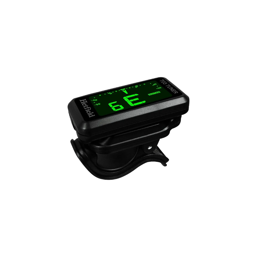 El afinador T03 Hetfield es una herramienta esencial para cualquier músico de instrumentos de cuerda. Diseñado para colocarse directamente en el clavijero (headstock), utiliza un sensor piezoeléctrico de alta sensibilidad que capta las vibraciones del instrumento en lugar del sonido ambiental. Esto permite una afinación perfecta incluso en entornos ruidosos, como ensayos de banda o antes de salir a un escenario.