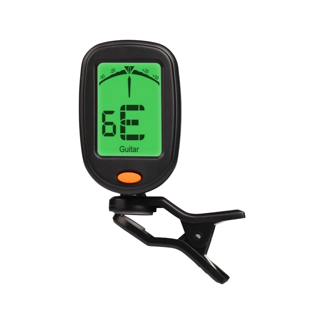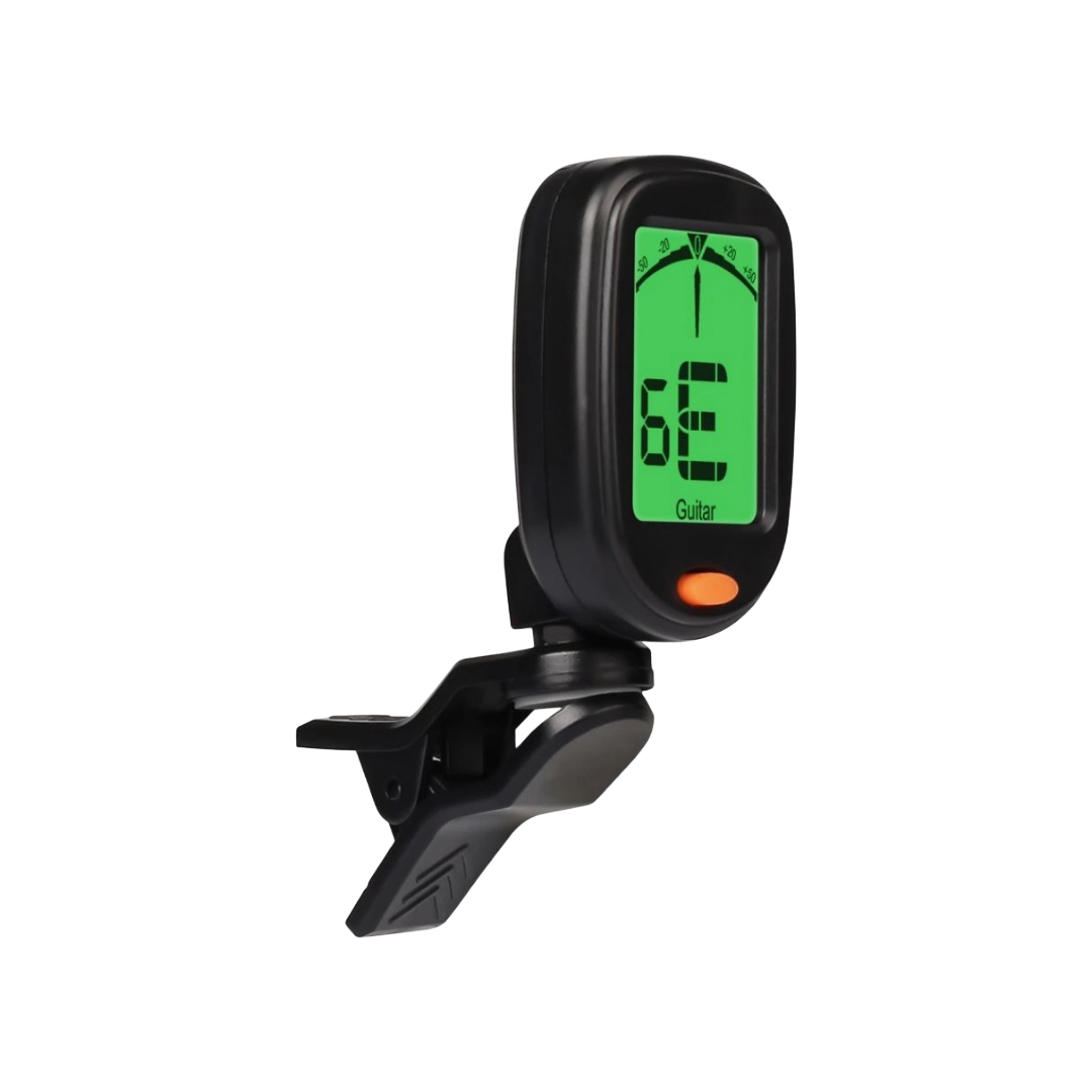 Este modelo destaca por su pantalla LCD retroiluminada de alto contraste que cambia de color: se mantiene en naranja mientras buscas la nota y cambia a verde brillante cuando la cuerda está perfectamente afinada. Su diseño con doble rotación de 360 grados permite orientar la pantalla en cualquier ángulo para que siempre sea visible, sin importar si eres diestro o zurdo.