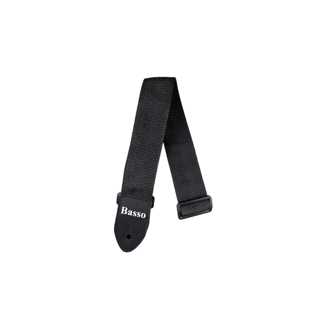 Correa sintética negra. Tiene 5 cm de ancho y un forro sintético para no absorber el sudor y doble terminación para mayor durabilidad y seguridad en el instrumento. Longitud ajustable entre 0,85 y 1,50 metros.