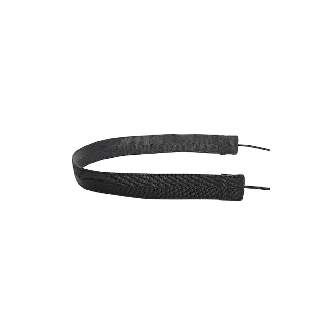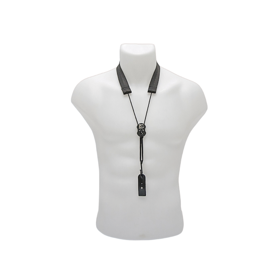 Cuello de nylon. Ajustador de ABS. Cordón elástico con gancho de metal equipado con 2 conectores de cuero.