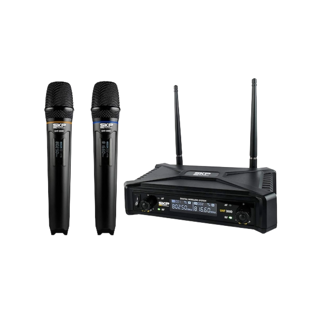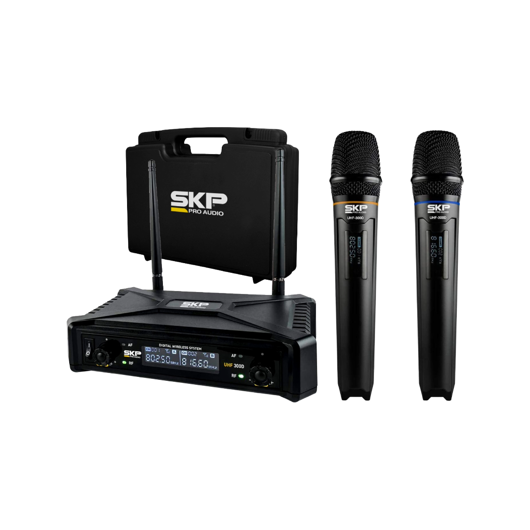 El SKP UHF-300D es un sistema diseñado para quienes necesitan dos micrófonos funcionando simultáneamente con un solo receptor. Al operar en la banda UHF (Ultra High Frequency), ofrece una conexión mucho más robusta y con menos ruido que los sistemas VHF convencionales, siendo ideal para iglesias, salones de conferencias, karaokes y animadores de eventos.