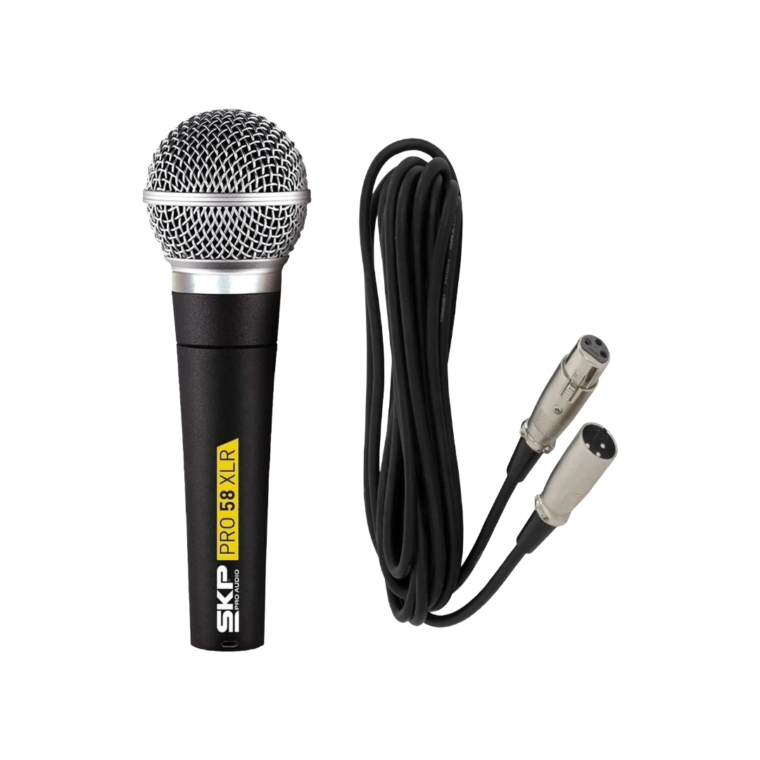 El SKP PRO-58 es un micrófono dinámico cardioide que destaca por su robustez y su capacidad para manejar niveles altos de presión sonora sin distorsionar. A diferencia del modelo Pro-20, el Pro-58 ofrece una respuesta de frecuencia más amplia y una construcción interna pensada para minimizar los ruidos de manipulación, lo que lo hace ideal para cantantes principales, coristas y presentadores.