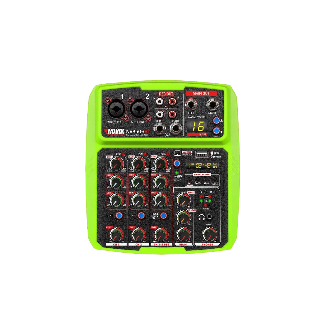 El Novik NVK-i06BT es un mixer analógico de 6 canales que combina portabilidad, conectividad moderna y funciones profesionales en un diseño compacto. Ideal para músicos, DJs, podcasters y técnicos de sonido que buscan una solución confiable y fácil de transportar, este equipo ofrece una experiencia de mezcla completa sin complicaciones.