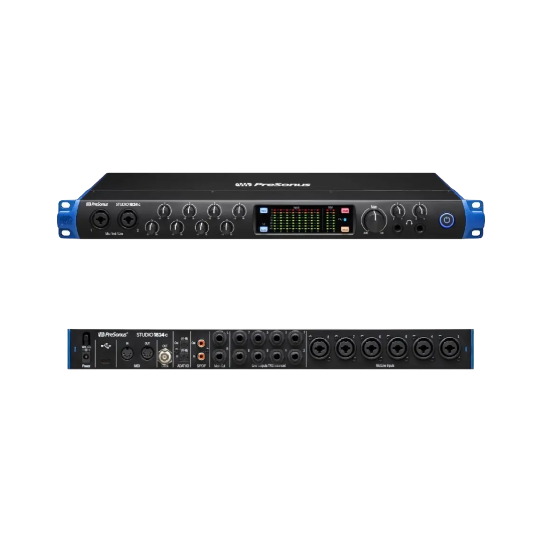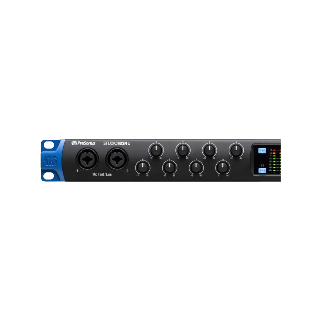 La PreSonus Studio 1824c es una interfaz de audio USB-C completa y potente, diseñada para productores, ingenieros y bandas que necesitan grabar baterías completas o múltiples instrumentos simultáneamente. Con una resolución de audio de calidad profesional de hasta 24 bits/192 kHz, esta unidad de rack (1U) integra 8 de los aclamados preamplificadores de micrófono analógicos XMAX Clase A, garantizando un sonido rico en armónicos, con graves profundos y agudos suaves y naturales.